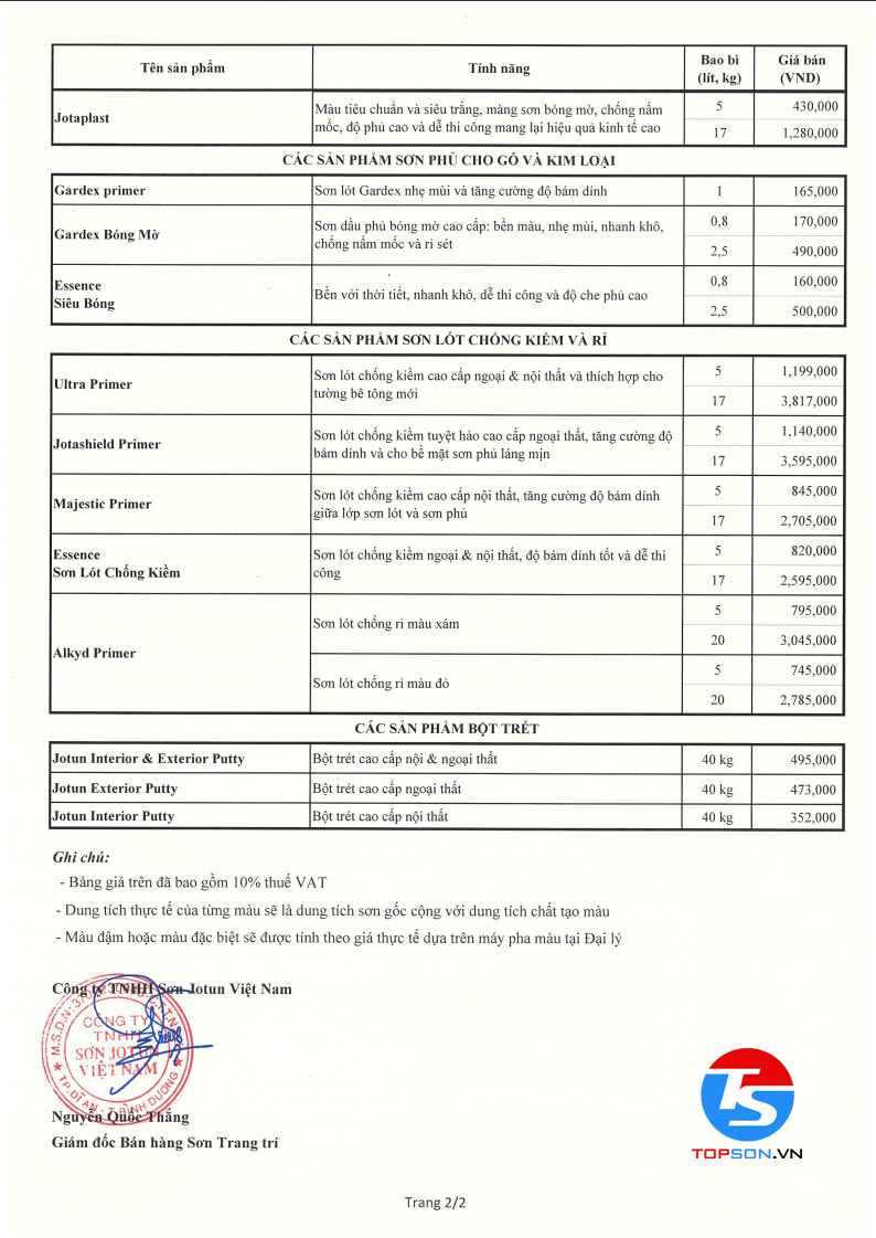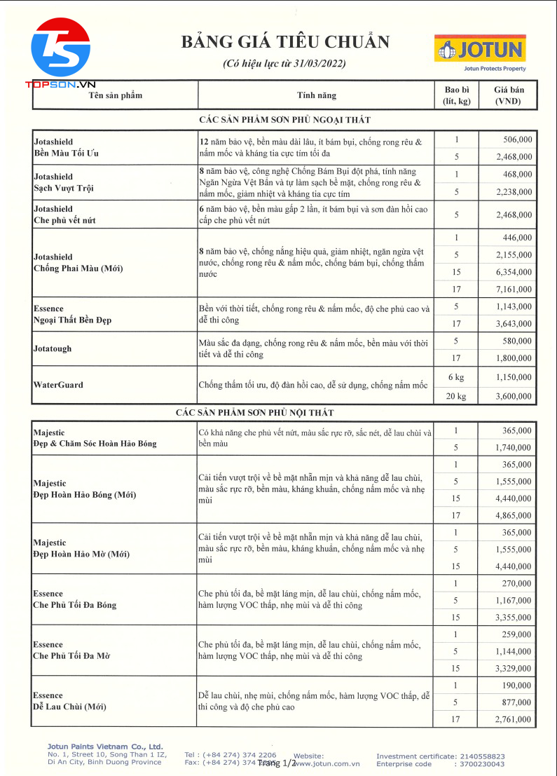 Như đã chia sẻ ở trên để đảm bảo cho khách hàng có được quá trình lựa chọn sản phẩm tốt nhất tại TOPSON. Bất kỳ ai khi ghé thăm doanh nghiệp chúng tôi cũng nên tham khảo bảng giá sơn Jotun, từ đó đưa ra cho bản thân những quyết định chuẩn xác. Bạn có thể tham khảo chi tiết ngay dưới đây.