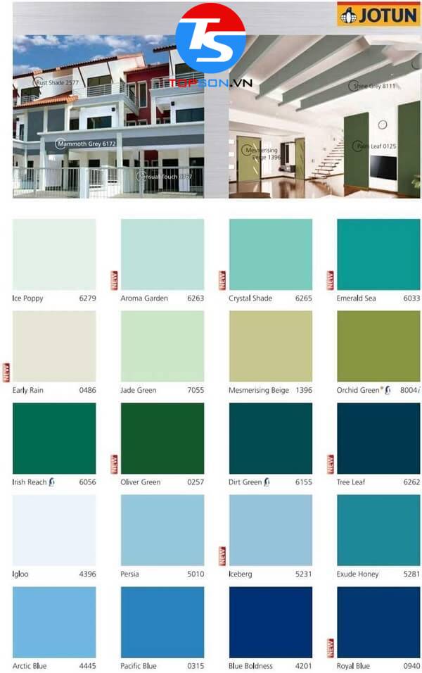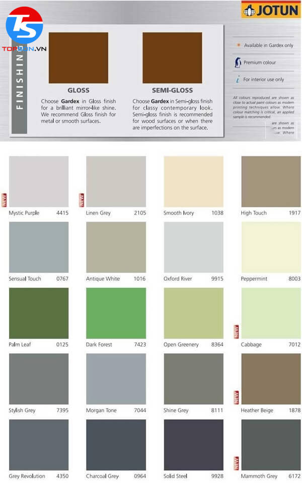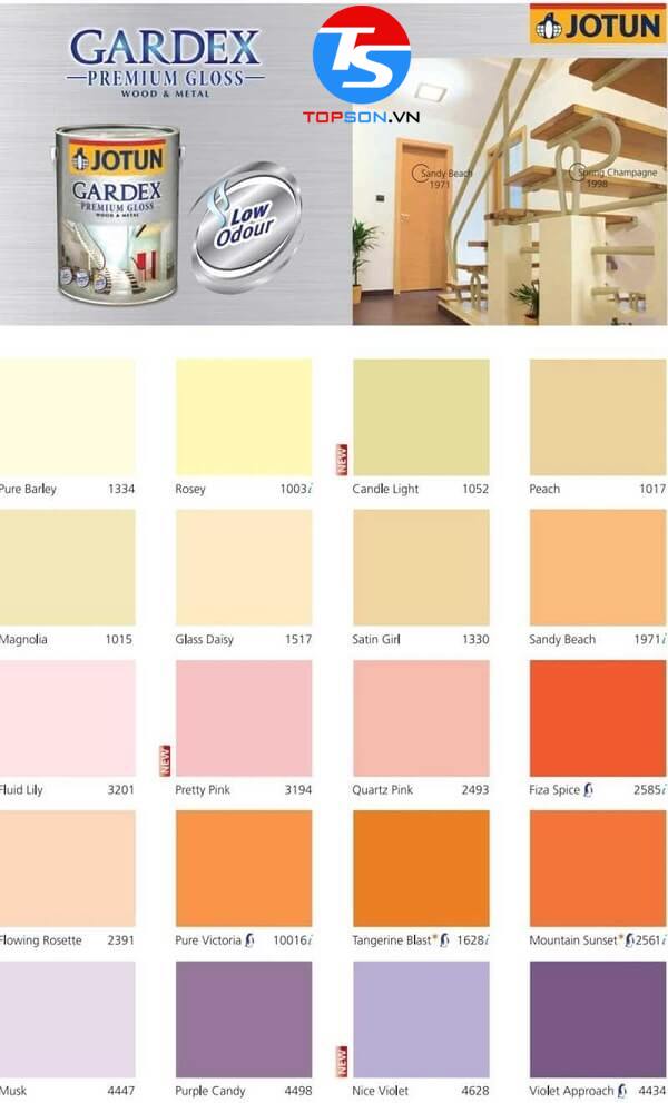 Sơn dầu thương hiệu Jotun được chia thành các phân loại đặc tính riêng biệt, bao gồm: Gardex (bóng & mờ) và có chung 1 bảng màu như dưới đây: