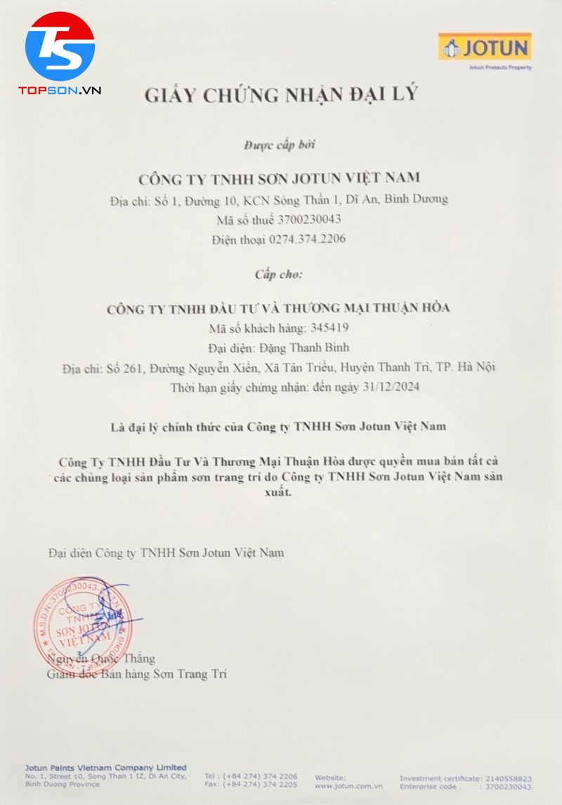 - Có hợp đồng mua bán sơn chính hãng sơn Jotun do Topson Việt Nam cung cấp