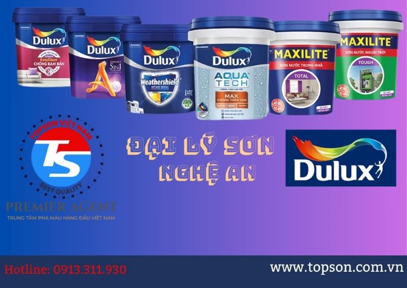 Đại lý sơn Dulux tại Nghệ An thuộc hệ thống nhà phân phối của Đại lý sơn Dulux Thuận Hòa (Topson Việt Nam): Đại lý Sơn hàng đầu Tại Việt Nam – một trong những đơn vị đi đầu trong lĩnh vực sơn trang trí trên toàn quốc. là địa chỉ đáng tin cậy cho việc mua sắm sơn chất lượng cao và đa dạng mẫu mã. Với sự chuyên nghiệp và kinh nghiệm lâu năm trong ngành, chúng tôi tự hào là đối tác đáng tin cậy của khách hàng tại khu vực này.