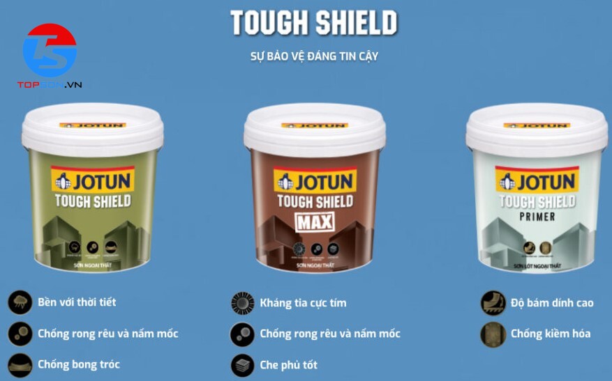 Sơn ngoại thất Jotun toughshield: là sản phẩm ngoại thất gốc acrylic biến tính đem tới bề mặt láng mịn và bóng mờ cho bề ngoài của công trình. Đây là loại sơn phù hợp với các kết cấu bề mặt bằng bê tông hoặc vữa.