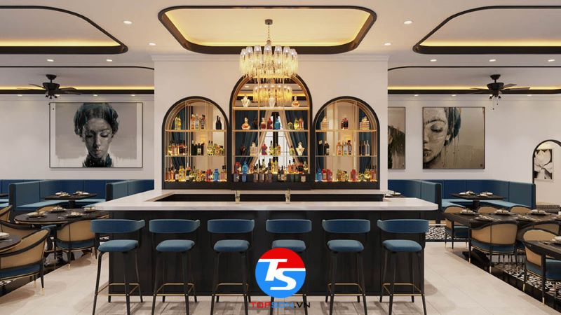 - Khu vực phòng ăn, bếp và quầy bar: Thường được đặt ở tầng 2 hoặc vị trí trung gian, thuận tiện cho du khách di chuyển đến ăn uống, thư giãn và vui chơi. Không gian này cần được thiết kế một cách đẹp mắt, rộng rãi và sạch sẽ để mang lại cảm giác thoải mái và ngon miệng cho khách hàng.