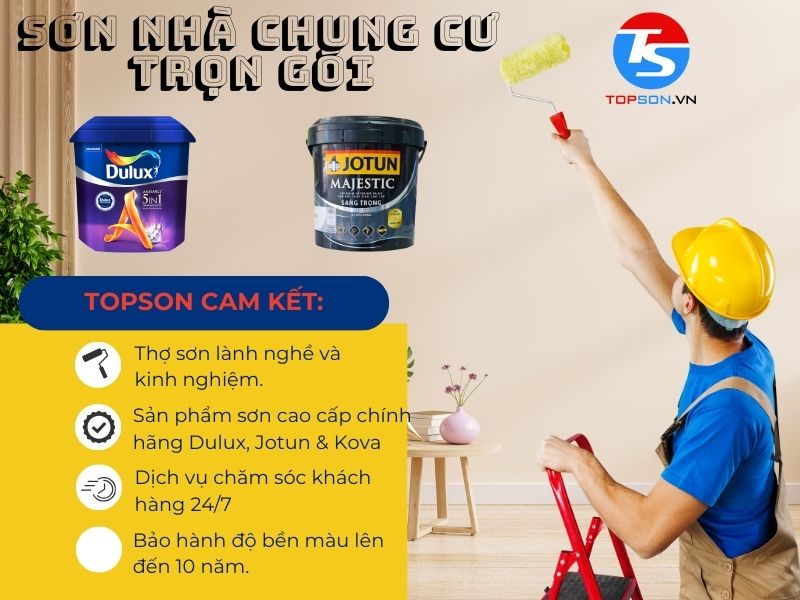 Nếu bạn muốn sơn nhà chung cư một cách nhanh chóng, đẹp mắt và tiết kiệm chi phí, Topson Việt Nam là lựa chọn hàng đầu của bạn. Chúng tôi cam kết mang đến cho bạn không gian sống hoàn hảo với mức giá phải chăng.