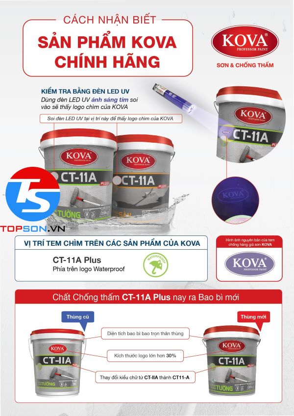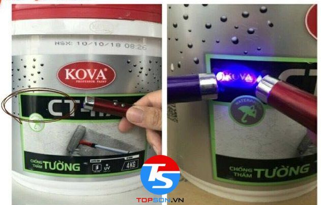 - Ngoài ra, bạn có thể dùng đèn LED UV để kiểm tra tem chống hàng giả. Bằng cách chiếu sáng vị trí phía trên Logo chống thấm nước cho dòng sản phẩm CT-11A và phía trên logo TUV.PSB cho dòng sản phẩm CT-04, bạn có thể xác minh tính chính hãng của sơn Kova.