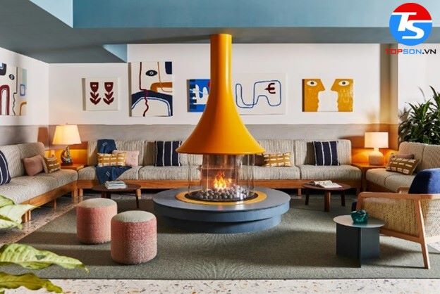 - Nâu socola tạo ra không gian sống động và màu sắc rực rỡ khi phối màu với cam độc đáo, tạo nên ảo ảnh về phong cách retro cổ điển.