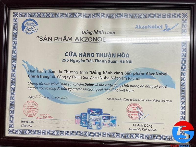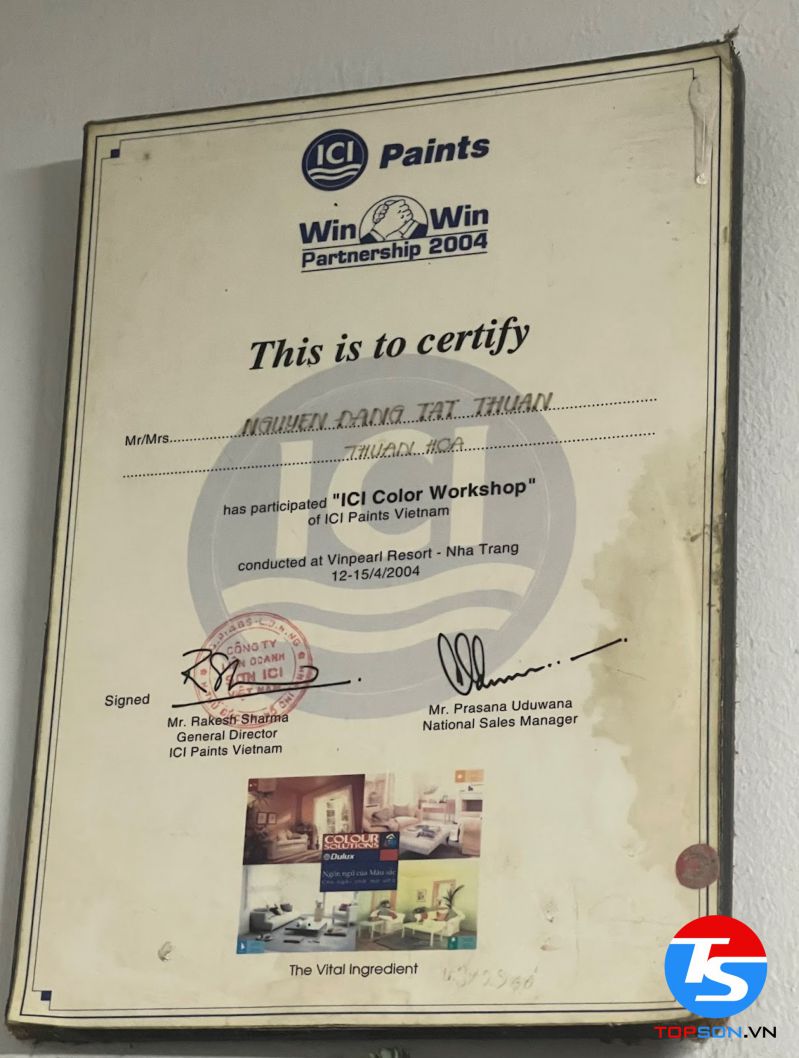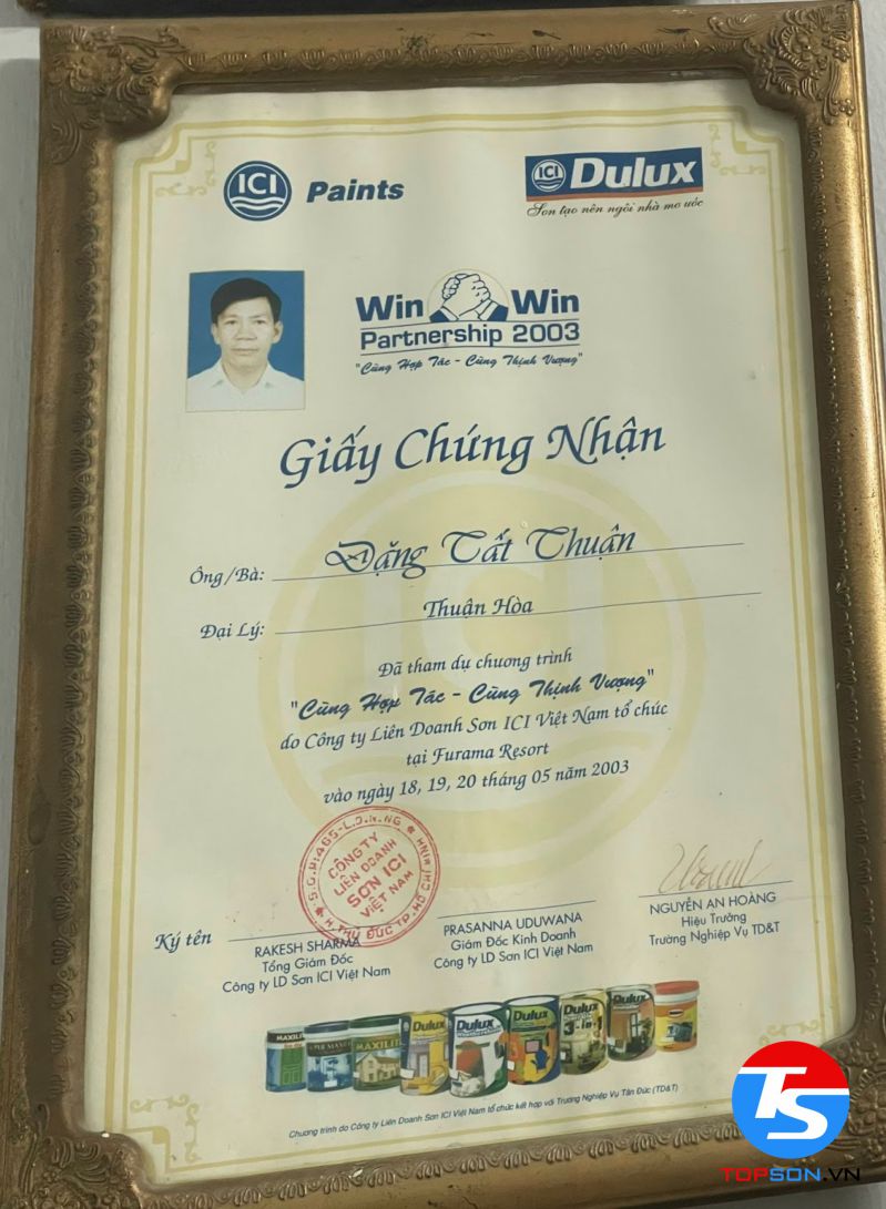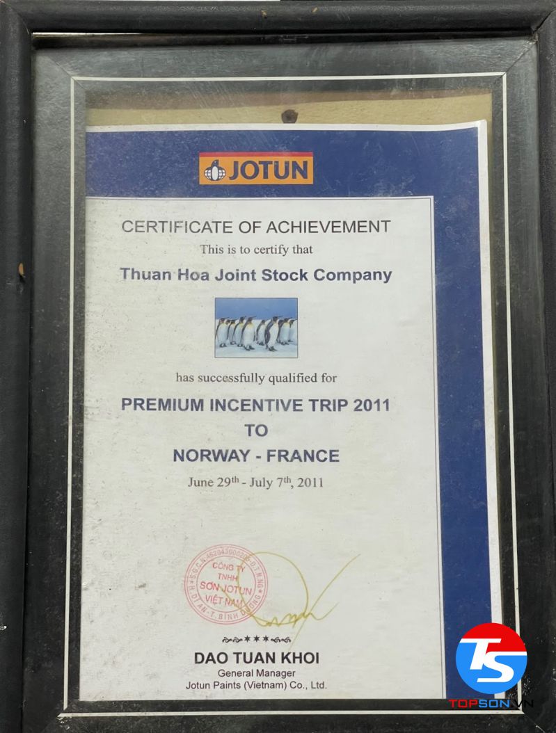 Trong những giấy chứng nhận mà TOPSON đã gặt hái được trong thời gian qua, chứng nhận khiến chúng tôi tự hào nhất phải kể đến là đại lý phân phối sơn nội ngoại thất cao cấp số 1 tại Việt Nam. Đây không chỉ là sự minh chứng cho thành công và cố gắng của TOPSON mà chính là sự đánh giá của khách hàng với sản phẩm của chúng tôi.