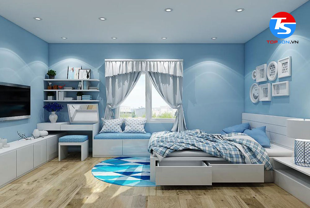 Còn nếu là vợ chồng son thì bạn có thể chọn lựa sắc màu trắng - xanh để giúp không gian phòng được thoáng đãng và rộng rãi hơn. Đem đến những giờ phút nghỉ ngơi thư giãn nhất.
