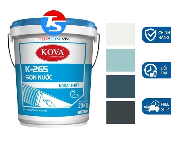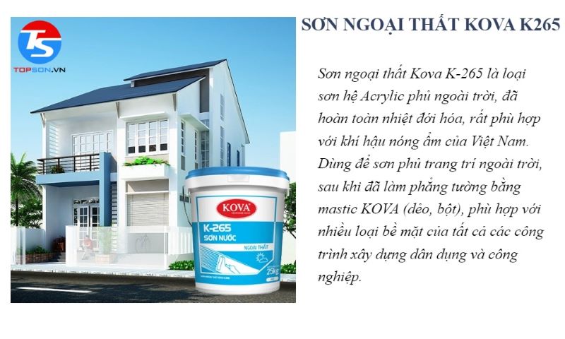 SƠN NGOẠI THẤT KOVA K-265 là loại sơn hệ Pure Acrylic được sử dụng để trang trí và chống thấm cho các công trình xây dựng dân dụng và công nghiệp. Sơn này đã được nhiệt đới hóa hoàn toàn, phù hợp với khí hậu nóng ẩm của Việt Nam.