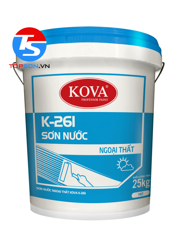 Sơn ngoại thất KOVA K-261 được đóng gói trong thùng 5kg và 25kg. Sản phẩm được áp dụng trên bề mặt ngoại thất của tường bê tông, vữa, xi măng sau khi đã được làm phẳng và được phủ sơn lót kháng kiềm ngoại thất. Độ dày khô của sơn là 40-60μm cho một lớp, tùy thuộc vào yêu cầu thi công và kỹ thuật thi công.