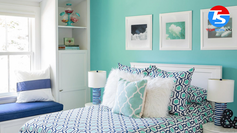 Sơn nhà màu xanh ngọc sẽ tạo cảm giác cho bạn bạn sẽ được cân bằng về mặt tâm hồn, giúp con người trở nên thoải mái và không bị căng thẳng. Đặc biêt, việc sử dụng màu xanh ngọc trong thiết kế phòng ngủ sẽ mang đến cho gia chủ một giấc ngủ ngon và sâu hơn, khiên cho gian phòng trong lành hơn.