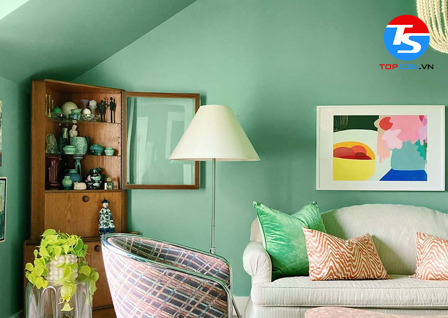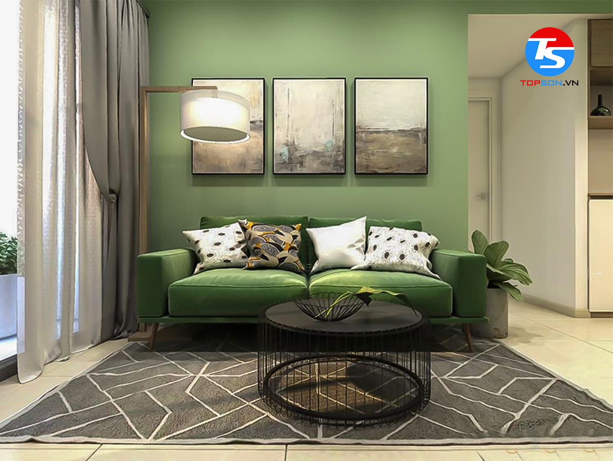 Một thiết kế phòng khách với tông màu sơn xanh lá mát mắt